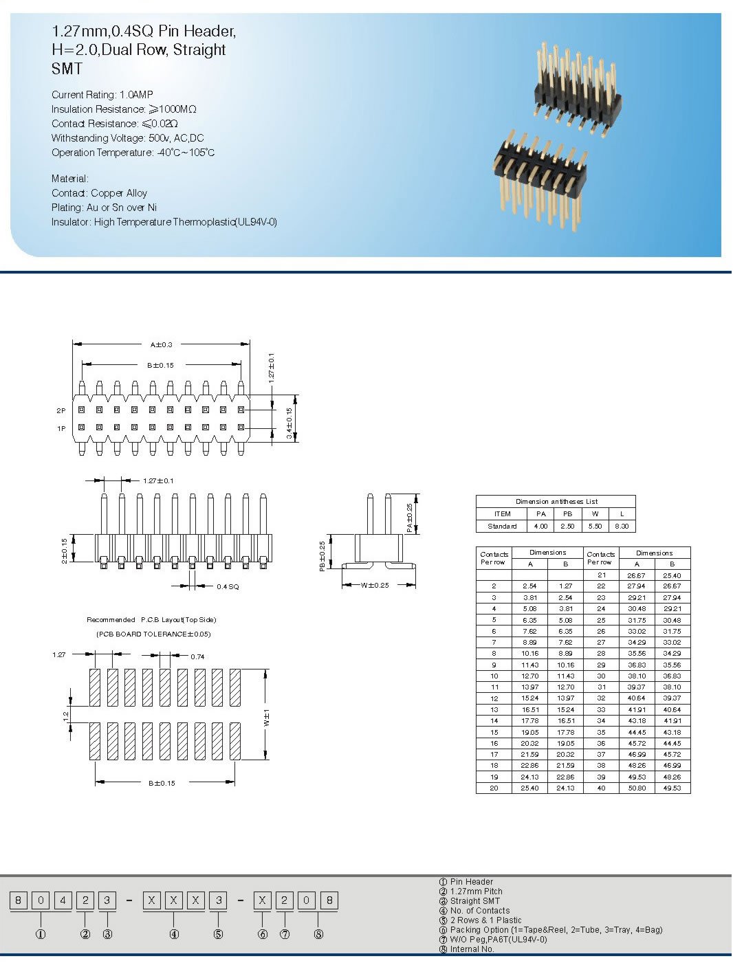 1.27mm,0.4SQ Pin Header,