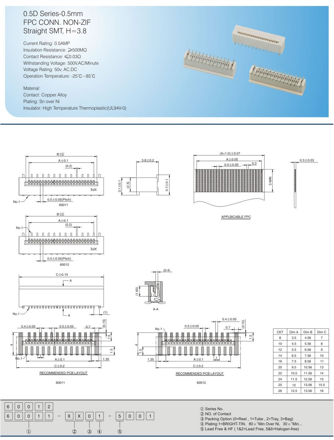 0.5D Series-0.5mm FPC CONN. NON-ZIF Straight SMT, H=3.8 Current Rating: 0.5AMP Insulation Resistance:≥50OMΩ Contact Resistance:≤0.03Ω Withstanding Voltage:50OV,AC/Minute Voltage Rating:50v, AC,DC Operation Temperature:-25℃-85℃ Material: Contact: Copper Alloy Plating: Sn over Ni Insulator: High Temperature Thermoplastic(UL94v-0)