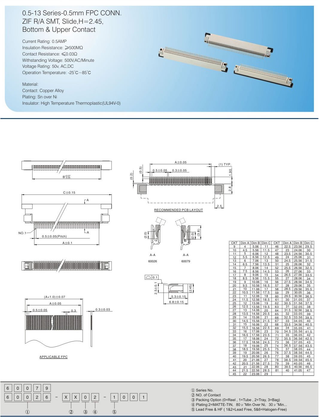 0.5-13 Series-0.5mm FPC CONN. ZIF R/A SMT, Slide,H=2.45, Bottom & Upper Contact Current Rating: 0.5AMP Insulation Resistance:≥500MΩ Contact Resistance:≤0.03Ω Withstanding Voltage:500V,AC/Minute Voltage Rating:50v, AC,DC Operation Temperature:-25℃-85℃ Material: Contact: Copper Alloy Plating: Sn over Ni Insulator: High Temperature Thermoplastic(UL94V-0)