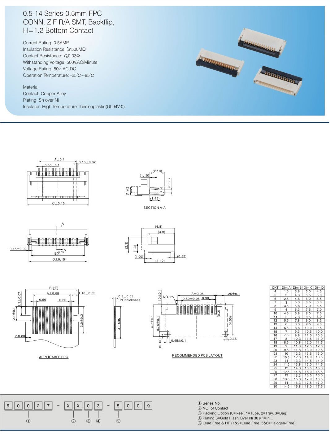 0.5-14 Series-0.5mm FPC CONN. ZIF R/A SMT, Backflip, H = 1.2 Bottom Contact Current Rating: 0.5AMP Insulation Resistance: >500MΩ Contact Resistance: C0.03Ω Withstanding Voltage: 500V.AC/Minute Voltage Rating: 50v, AC,DC Operation Temperature: -25℃-85 C Material: Contact: Copper Alloy Plating: Sn over Ni Insulator: High Temperature Thermoplastic(UL94V-0)