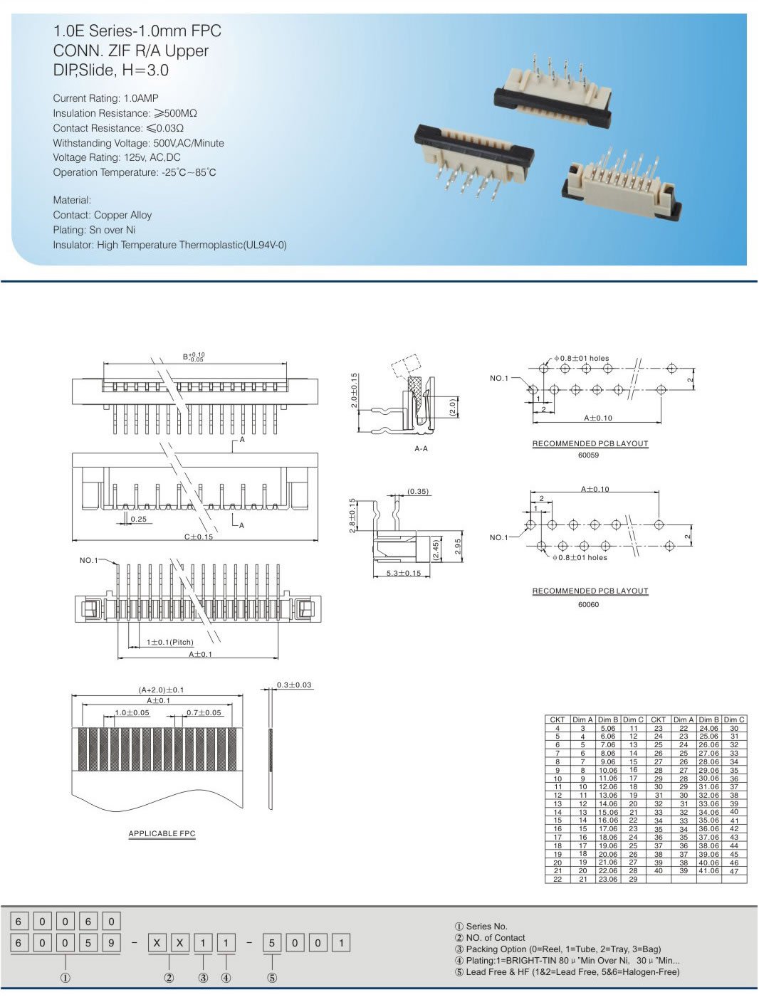 1.0-09 Series-1.0mm FPC CONN.ZIF R/A SMT, Flip, H=2.0,Dual Bottom Contact Current Rating: 1.0AMP Insulation Resistance:≥500MΩ Contact Resistance: ≤0.03Ω Withstanding Voltage:500V,AC/Minute Voltage Rating:50v,AC, DC Operation Temperature:-25℃-85℃ Material: Contact: Copper Alloy Plating: Sn over Ni lnsulator: High Temperature Thermoplastic(UL94V-O)