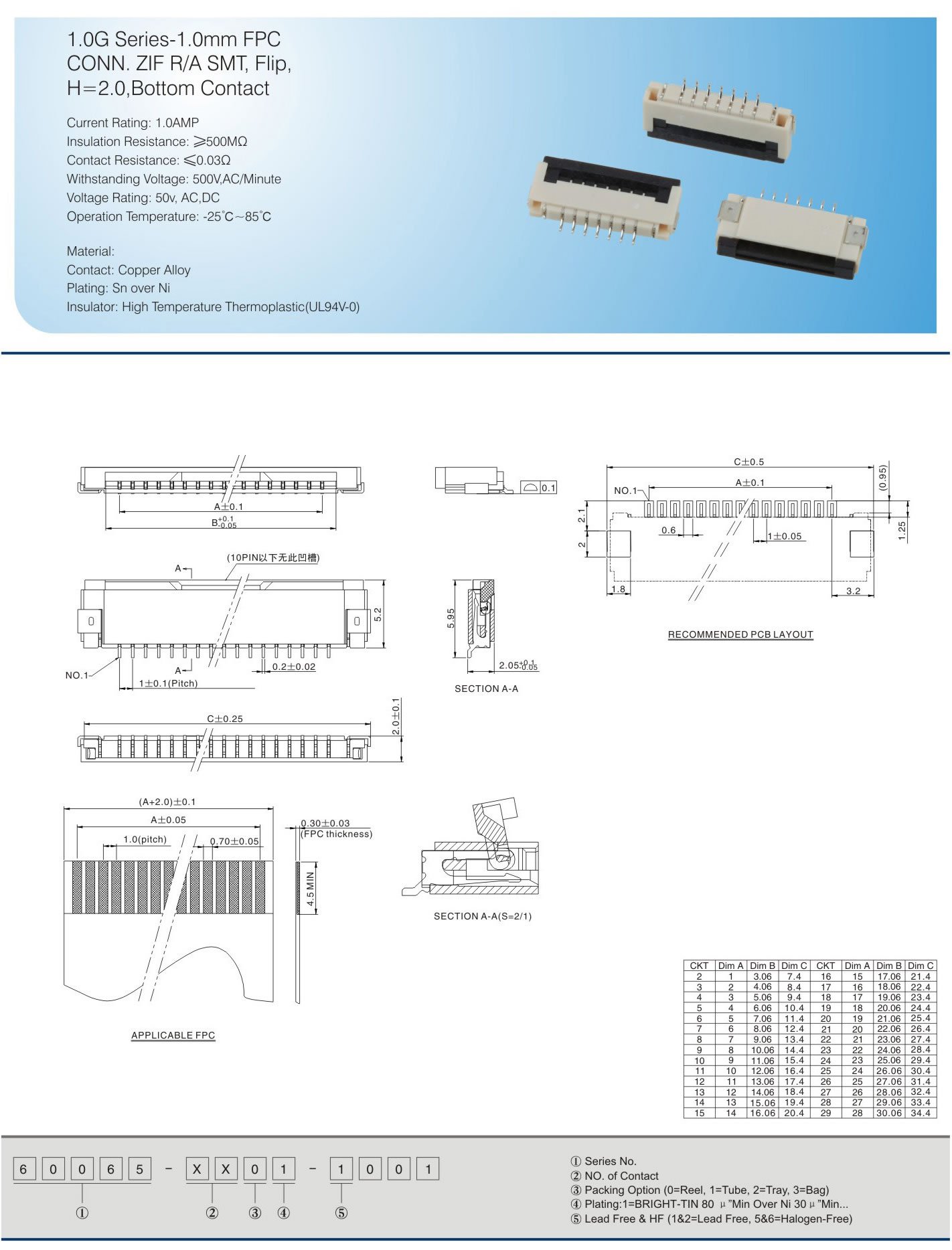 1.0-09 Series-1.0mm FPC CONN.ZIF R/A SMT, Flip, H=2.0,Dual Bottom Contact Current Rating: 1.0AMP Insulation Resistance:≥500MΩ Contact Resistance: ≤0.03Ω Withstanding Voltage:500V,AC/Minute Voltage Rating:50v,AC, DC Operation Temperature:-25℃-85℃ Material: Contact: Copper Alloy Plating: Sn over Ni lnsulator: High Temperature Thermoplastic(UL94V-O)