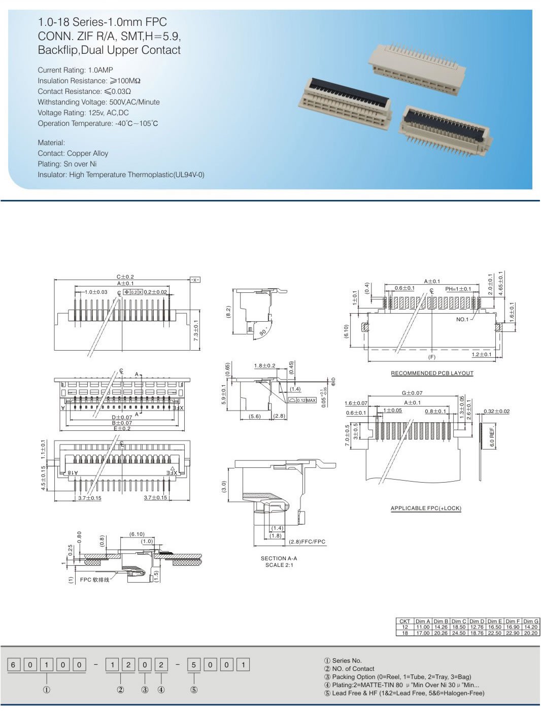 1.0-18 Series-1.0mm FPC CONN. ZIF R/A, SMT,H=5.9, Backflip,Dual Upper Contact Current Rating: 1.OAMP Insulation Resistance:≥100MΩ Contact Resistance:≤0.03Ω Withstanding Voltage:50OV,AC/Minute Voltage Rating: 125v, AC,DC Operation Temperature: -40C-105℃ Material: Contact: Copper Alloy Plating: Sn over Ni Insulator: High Temperature Thermoplastic(UL94V-0)