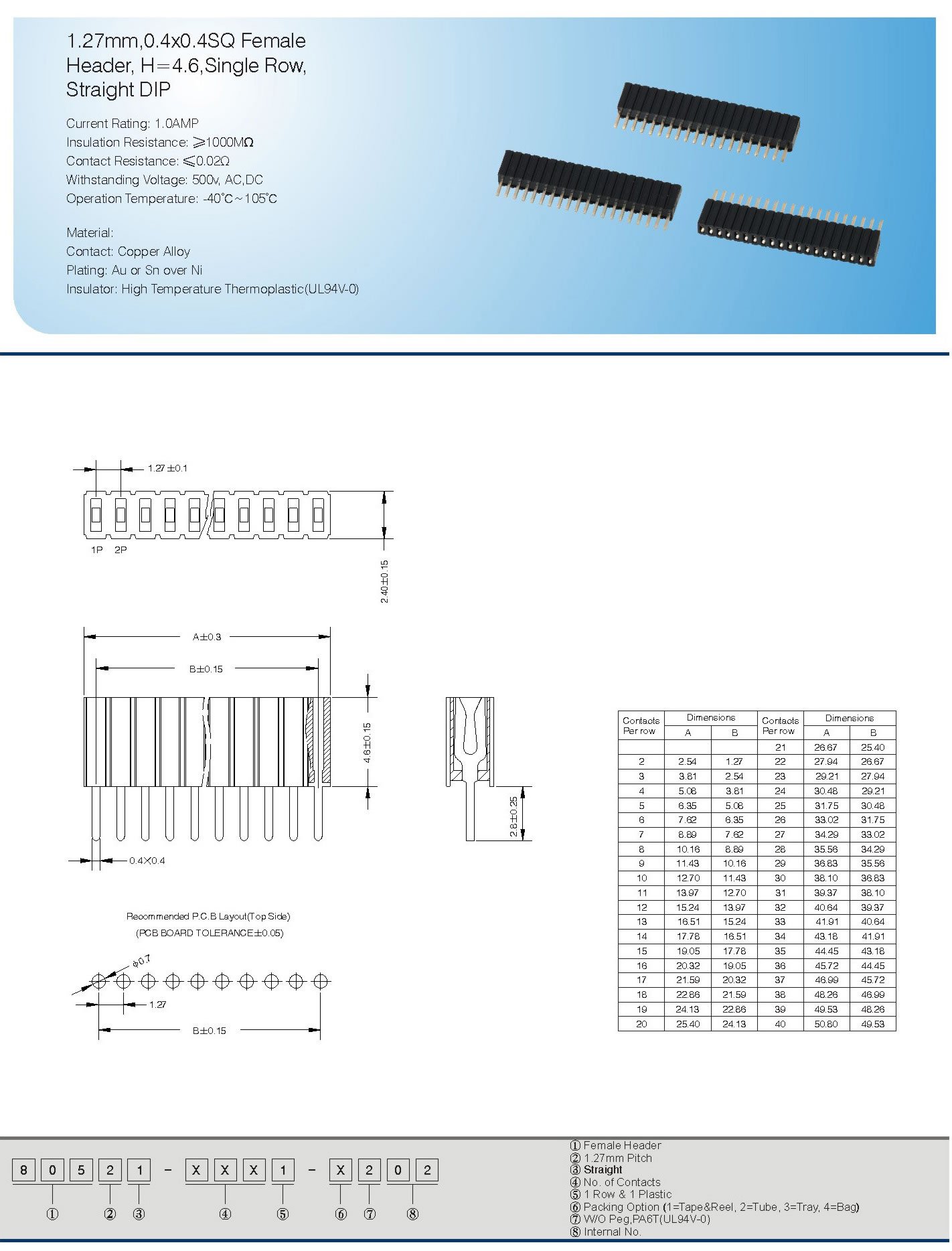 1.27mm,0.35x0.15SQ Female Header, H=2.0,Dual Row, Straight SMT Current Rating: 1.OAMP Insulation Resistance:≥1000MΩ Contact Resistance: ≤0.02Ω Withstanding Voltage:50Ov, AC,DC Operation Temperature: -40℃~105℃ Material: Contact: Copper Alloy Plating: Au or Sn over Ni Insulator: High Temperature Thermoplastic(UL94V-O)