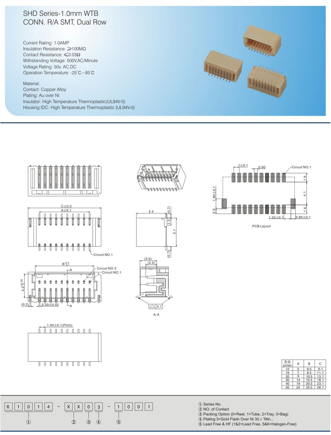 SHD Series-1.0mm WTB CONN. R/A SMT, Dual Row Current Rating: 1.0AMP lnsulation Resistance:≥100MΩ Contact Resistance:≤0.03Ω Withstanding Voltage: 50OV,AC/Minute Voltage Rating:50v,AC,DC Operation Temperature:-25℃-85℃ Material: Contact: Copper AlloyPlating: Au over Ni Insulator:High Temperature Thermoplastic(UL94v-O) Housing IDC: High Temperature Thermoplastic (UL94V-O)