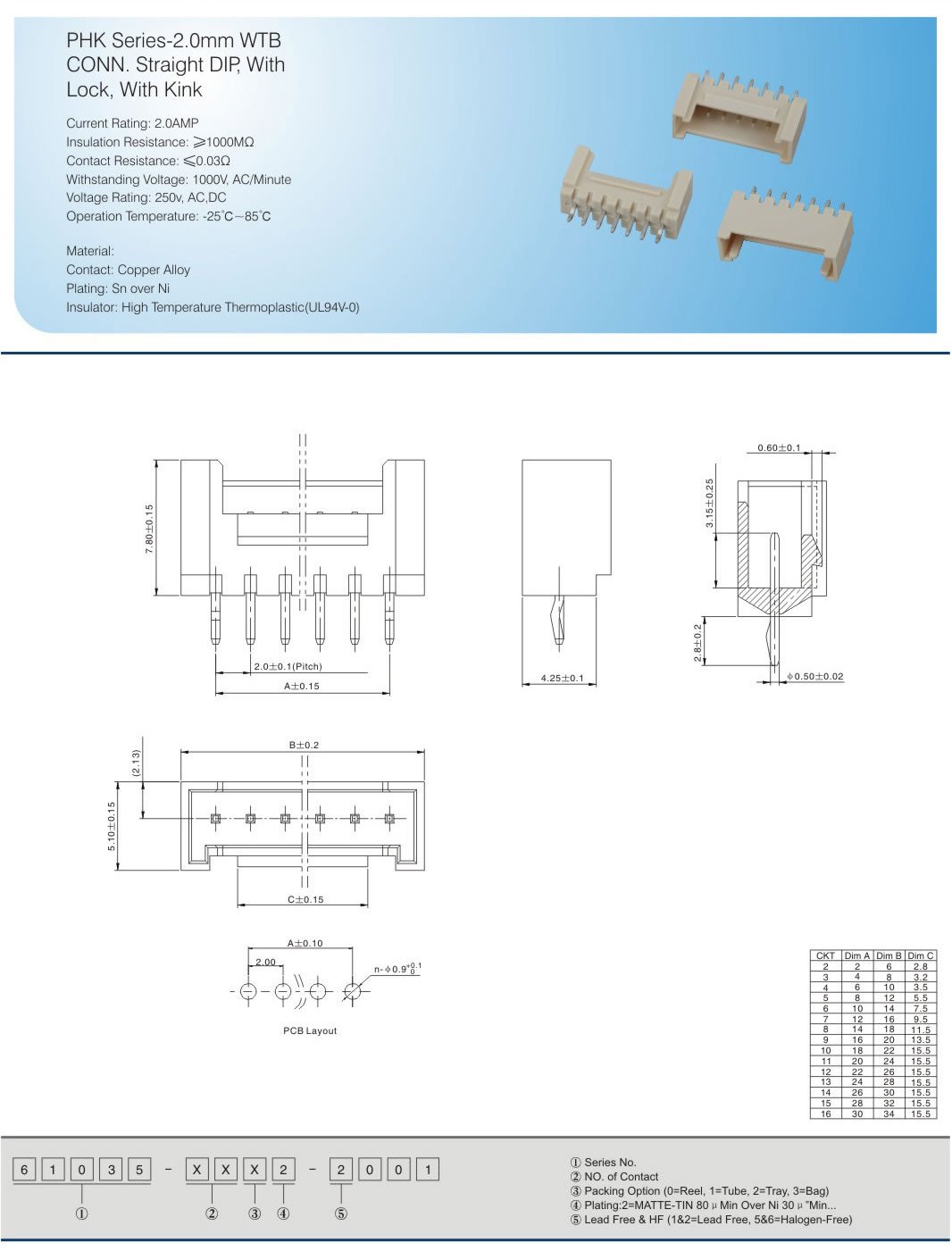 PHK Series-2.0mm WTB CONN.Straight DIP, With Lock, With Kink Current Rating: 2.OAMP Insulation Resistance: ≥100OMΩ Contact Resistance:≤0.03Ω Withstanding Voltage: 100OV, AC/Minute Voltage Rating: 250v, AC,DC Operation Temperature: -25°℃-85℃ Material: Contact: Copper Alloy Plating: Sn over Ni Insulator:High Temperature Thermoplastic(UL94v-O)