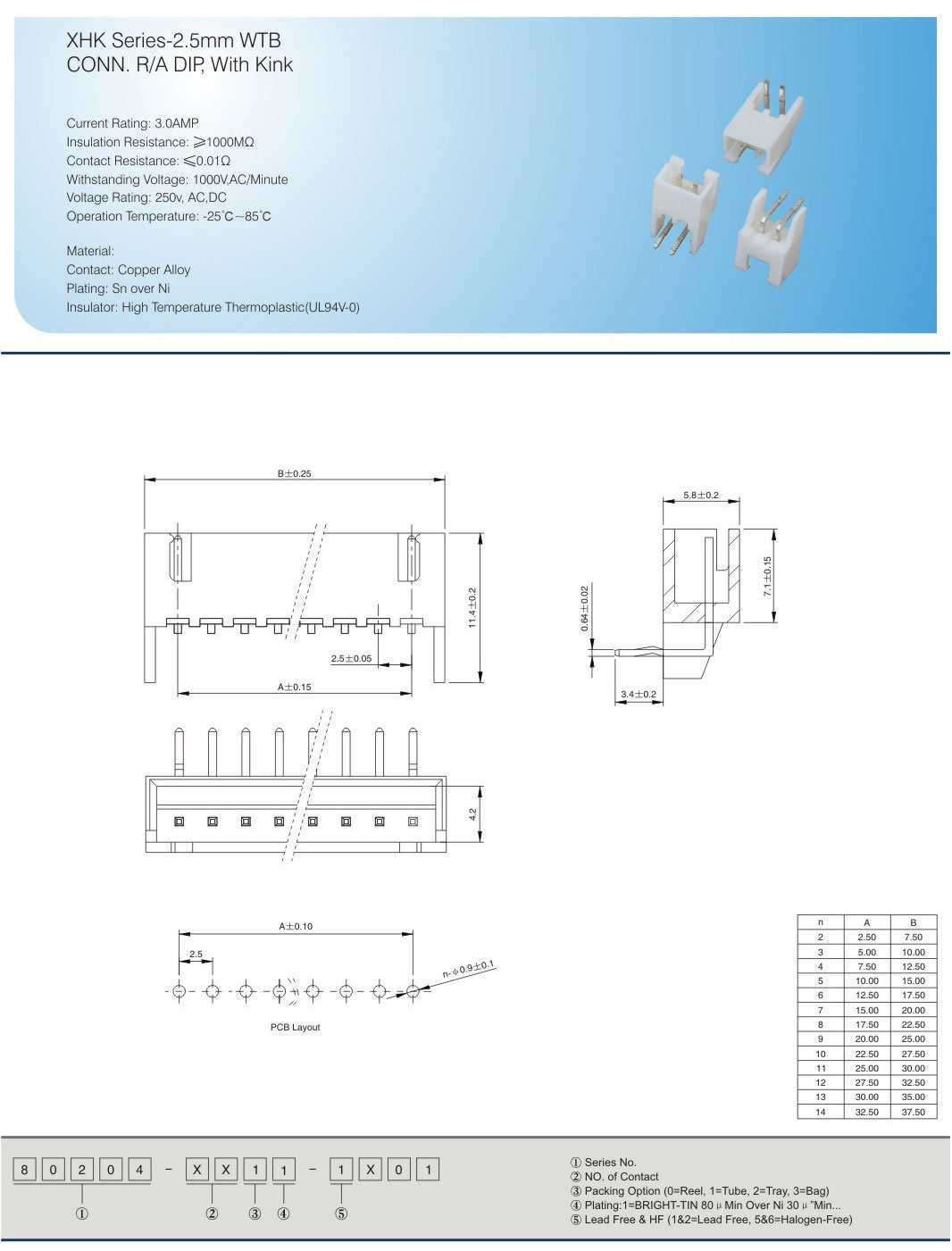 XHK Series-2.5mm WTB CONN.R/A DIP, With Kink Current Rating: 3.0AMP Insulation Resistance:≥100OMΩ Contact Resistance:≤0.01Ω Withstanding Voltage: 100OV,AC/Minute Voltage Rating: 250v, AC,DC Operation Temperature:-25℃-85℃ Material: Contact: Copper Alloy Plating: Sn over Ni Insulator: High Temperature Thermoplastic(UL94v-0)